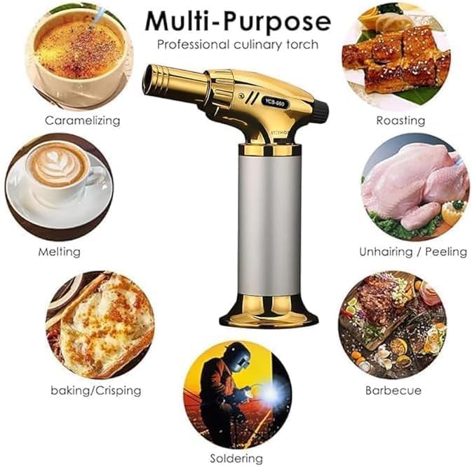 شعلة مطبخ احترافية للطهاة لون ذهبي، تعمل بالبوتان، مع لهب نفاث قابل للتعديل وقفل أمان. قابلة لإعادة التعبئة، مثالية للطبخ، شواء اللحوم، تحضير الحلويات، الشوي، واستخدامات المخيم والنار المفتوحة.