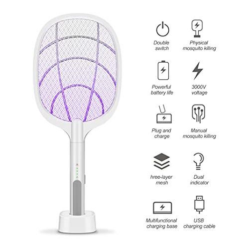 مضرب صاعق ذباب كهربائي 3 في 1، قاتل للحشرات، مضرب صاعق للحشرات، مصيدة بعوض مع ضوء ليد آمن محمول باليد لمكافحة الآفات للاستخدام الداخلي والخارجي والمنزل والمكتب، 42 سم