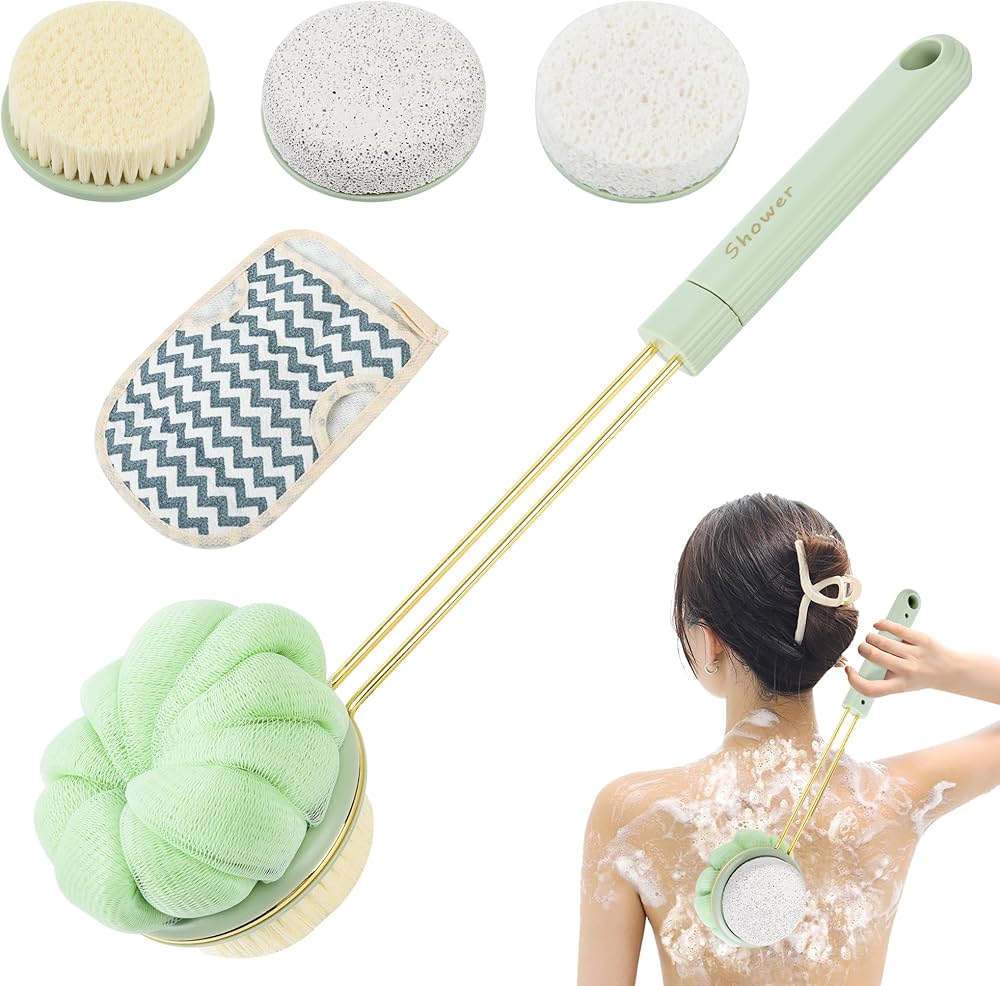 فرشاة استحمام للجسم 3 في 1 بمقبض طويل مزودة بحجر خفاف وشعيرات ولوفة لتقشير الظهر والجسم بالكامل، مثالية للتدليك والعناية بالبشرة، بمقبض مريح وشديد التحمل