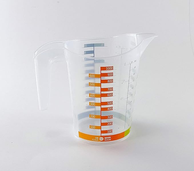 برطمان معايرة 1000 مل، 1 لتر، بلاستيك امن وصحي ونقي وقوي للغاية ومدرج بـ3 الوان لسهولة القراءة