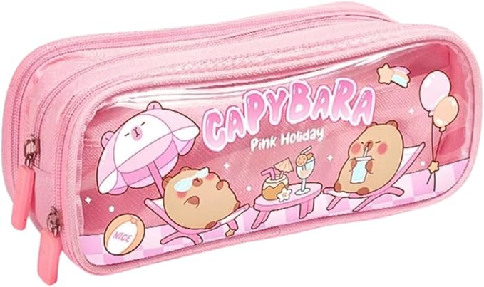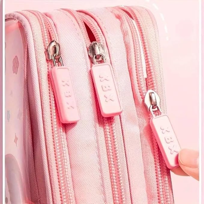 مقلمة أقلام رصاص شفافة من القماش بسعة كبيرة وطباعة كرتونية لطيفة مع ثلاث أقسام لتنظيم الأدوات المكتبية، متعددة الوظائف بتصميم سوستة متينة