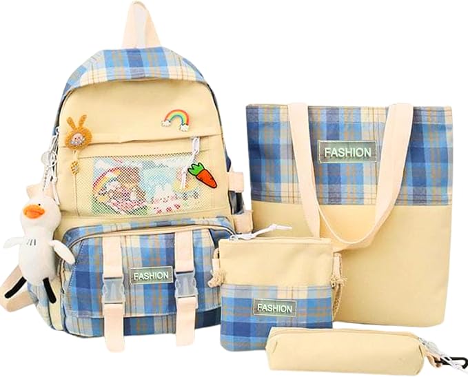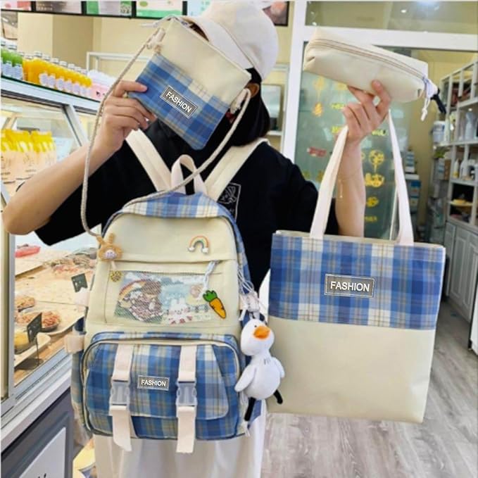مجموعة شنط ظهر كاجوال مقاومة للماء بنمط كوري للمدرسة والكلية مكونة من 4 قطع – شنطة ظهر للاب توب وشنطة يد وشنطة كروس وحافظة أقلام رصاص بدون أكسسوارات