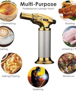شعلة مطبخ احترافية للطهاة لون ذهبي، تعمل بالبوتان، مع لهب نفاث قابل للتعديل وقفل أمان. قابلة لإعادة التعبئة، مثالية للطبخ، شواء اللحوم، تحضير الحلويات، الشوي، واستخدامات المخيم والنار المفتوحة.