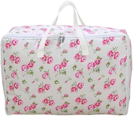 شنطة تخزين كبيرة محمولة مقاومة للماء مع سحابات، قماش اوكسفورد سميك شديد التحمل، شنطة منظمة مثالية للسفر واللحاف والبطانيات، مقاس جامبو 70 × 50 × 30 سم (بيج مع زهور وردية)