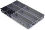 مصنوعة من بلاستيك رمادي عالي الجودة ومتين، تجمع هذه الصواني بين المتانة وخفة الوزن لتوفر استخدامًا موثوقًا يدوم لسنوات. كما أن اللون العصري المحايد يناسب جميع الديكورات، بينما تساعد القاعدة غير القابلة للانزلاق على تثبيت المنظمات داخل الدرج بإحكام.