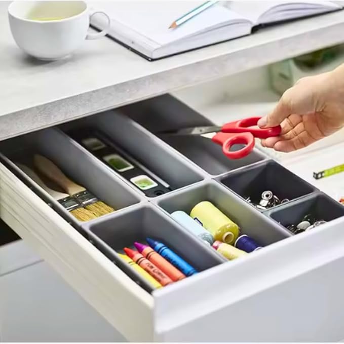 كل قطعة سهلة التنظيف بلمسة مسح بسيطة، كما يتيح التصميم المعياري إعادة ترتيب الأقسام حسب احتياجاتك. سواء كنت ترتب درج المطبخ أو تنظف مساحة عملك، فإن مجموعة التنظيم القابلة للتعديل هذه هي الحل المثالي لإضافة النظام والراحة إلى حياتك اليومية.
