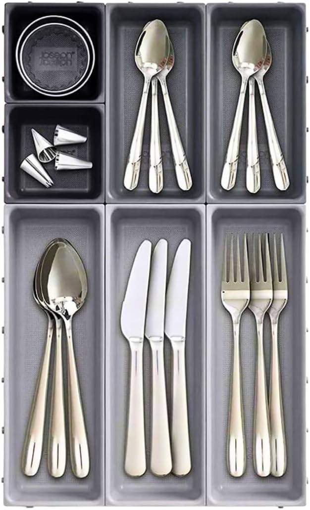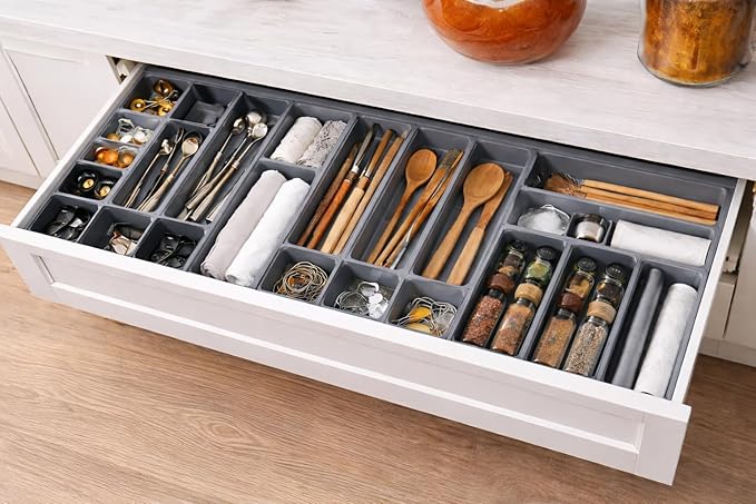 حوّل الأدراج المزدحمة إلى مساحات مرتبة ومنظمة بسهولة مع مجموعة من 14 قطعة لتنظيم الأدراج وصواني تخزين أدوات المائدة القابلة للتمديد.