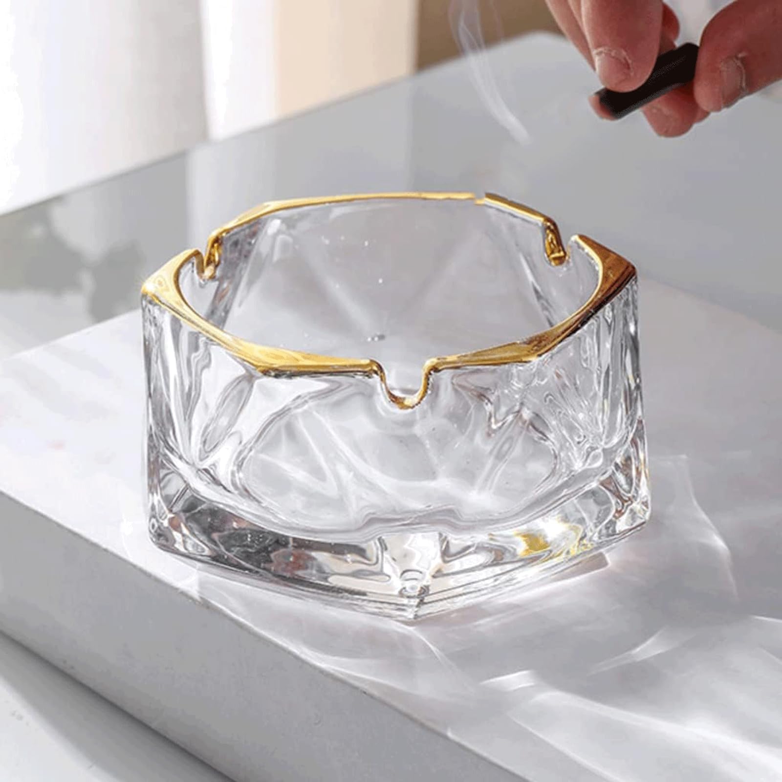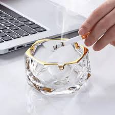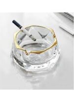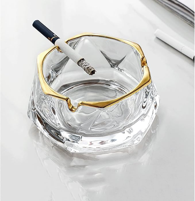 طفاية سجائر زجاج كريستال كبيرة شفافة أنيقة مقاومة للرياح مع 3 أخاديد، مطفئة سجائر وزينة عصرية للمنزل والمكتب والفندق وغرفة المعيشة، زجاج أنيق ذهبي (نمط 1)