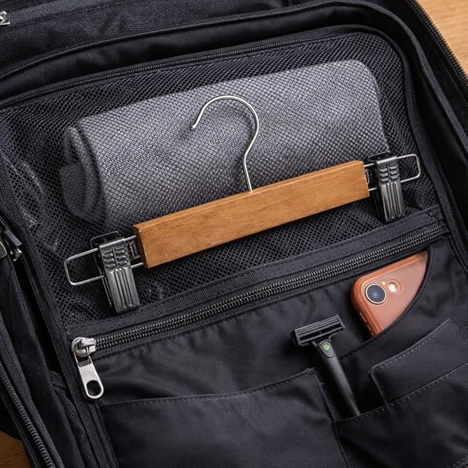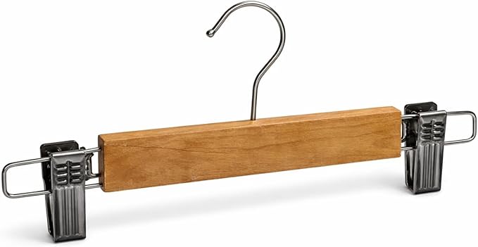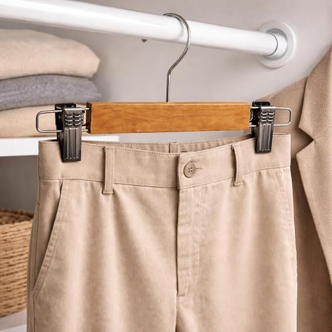 علاقة ملابس بمشابك خشبية مع خطافات معدنية قوية، مزودة بمشابك قابلة للتعديل لتثبيت التنانير والبناطيل والأوشحة، حل تخزين منظم للملابس بتشطيب خشبي طبيعي متين وموفر للمساحة داخل خزانة الملابس.