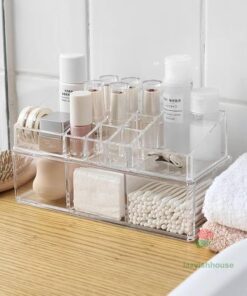 منظم مكياج من ثلاث أدراج، بتصميم عصري، شفاف، مصنوع من الأكريليك، قابل للتكديس، مع 9 حوامل لأحمر الشفاه