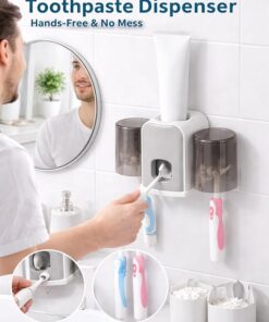 حامل فرش أسنان متعدد الوظائف يُثبت على الحائط مع أكواب وموزع معجون أسنان تخزين صحي للحمام مناسب للعائلة للعناية اليومية بصحة الفم.