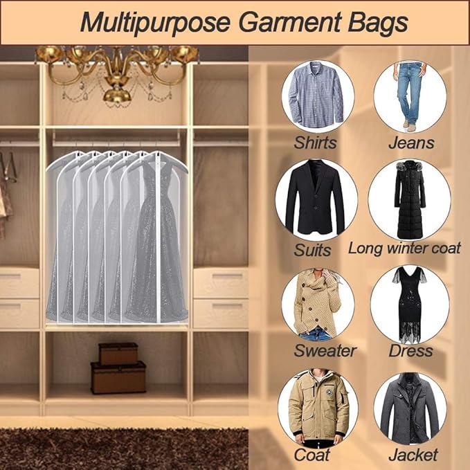 مجموعة من 5 اكياس ملابس للتخزين في الخزانة 60 × 100 سم، غطاء بدلة بلاستيكي بسحاب مقاوم للماء شبه شفاف للبدلات والقمصان والمعاطف والجاكيتات، واقي ملابس مقاوم للغبار بدون شماعة