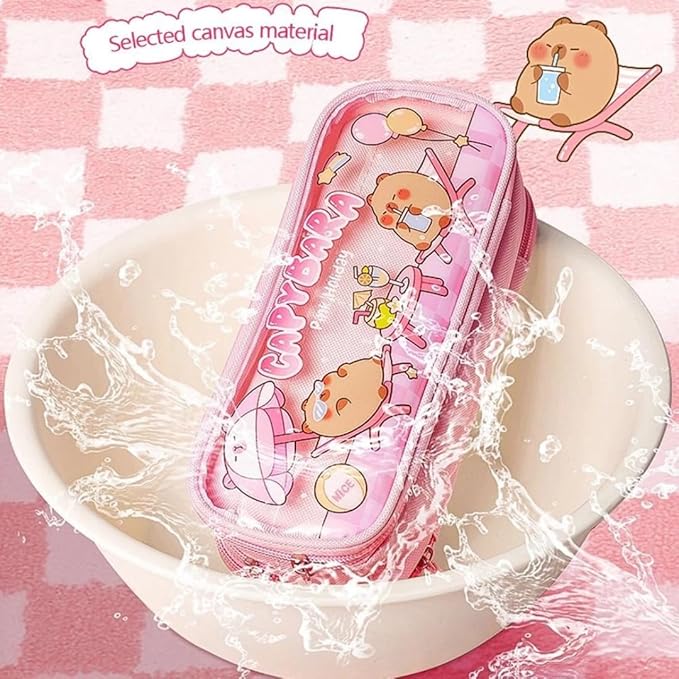 مقلمة أقلام رصاص شفافة من القماش بسعة كبيرة وطباعة كرتونية لطيفة مع ثلاث أقسام لتنظيم الأدوات المكتبية، متعددة الوظائف بتصميم سوستة متينة