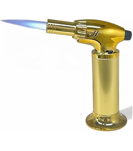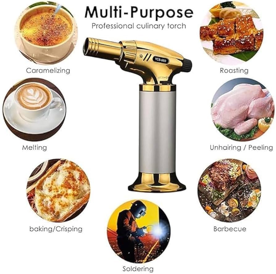 ولاعة طهي احترافية شيفس بروفيشنال، ولاعة غاز بوتان مع قفل أمان، ولاعة غاز قابلة لإعادة الملء، ولاعة قابلة للتعديل لطهي الطعام والشواء واللحوم والحلوى، وإشعال نار المخيم ( لون ذهبي )